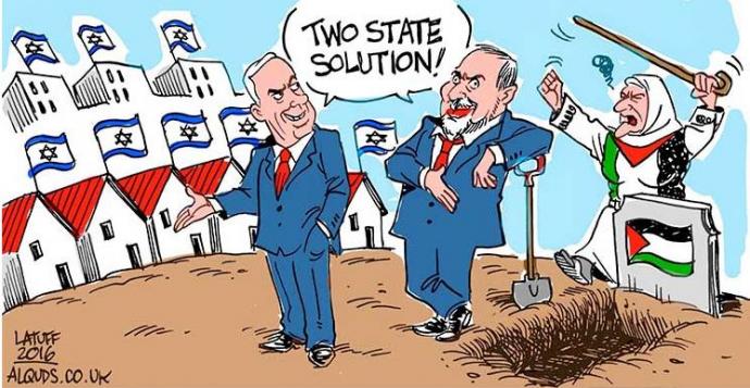 Outgoing US Secretary of State John Kerry recently preached against Israel’s becoming an apartheid state; seventy foreign ministers now gather in Paris to save Israel from losing its democratic character; the Zionist Left is tormented by the “regulation” law (that would legalize West Bank settlements built on private Palestinian land) and are determined to bring down the Netanyahu’s government at every chance. And Bibi, meanwhile, is doing his thing: smoking expensive cigars, drinking fine champagne, and laughing at everyone. “There will be nothing,” he says, even when there is something, “The Left can relax.” Bibi is not going to annex Area “C” even if Trump lets him, because he understands that his future is linked to Abbas’ future. Both continue to hold onto the lie of the two-state solution because it guarantees their power for years to come.